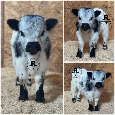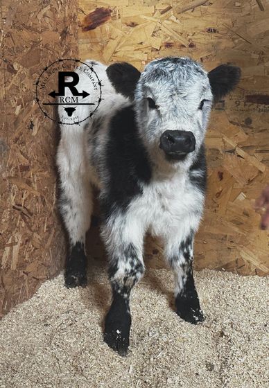 Born on March the 29th, baby Indy was bound and determined to come one way or another and it was backwards ! Her dam RCM Blackberry gave us all the signs something wasn’t right and on palpation Indy was upright but coming backwards. We were easily able to chain up and pull baby Indy with ease. Coming out backwards didn’t phase Indy one bit, she was up and going in no time. Indy is a beautiful combination of both her parents breeds - The White Galloway x Highpark - two double coated breeds of cattle. Indy is polled coming from her dam Blackberry, Chondro Positive coming from her sire RCM Mighty Warrior and she is perfection marked with her bold and thick speckles through her coat. Indy is going to make a phenomenal breeding female for any chondro female breeding program.