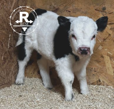 RCM Baby Doll and RCM Joker Face nailed it with this adorable and tiny but mighty little panda heifer - Dolly. Chromed up from the tip of her tail to her head, Dolly is one flashy and compact chondro positive and polled heifer calf. Her markings are sensational and laid down from both side of her genetics. Both parents are home raised pandas on our ranch from our original breeding stock. Dolly is a tiny little nugget at just 20 inches and she is just as cute as a button.