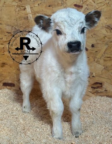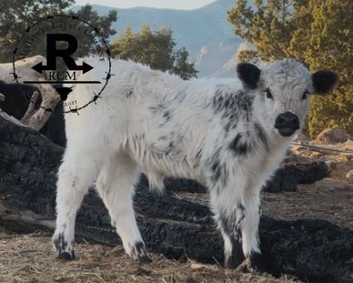This guys linage on our ranch goes all the way back to our original herd sire RCM King George - the bull who started it all. RCM Mickey was born on April 11th to RCM Bambi and RCM Silver Sterling. Bambi was born on our ranch to RCM Cloudy x RCM King George making Mickey a 3rd generation bull calf. Mickey is a 50% Highland x 25% Whitepark x 25% British White, Dun Tipped, Polled and Non Chondro. He is an incredibly small framed bull calf whom will make an exceptional choice for a Chondro Female Program coming from generationally proven small framed non chondro genetics. Great calving ease and a low birth weight of 44lbs. If you’re looking for a nice small framed non chondro bull for your chondro females, Mickey is your man!