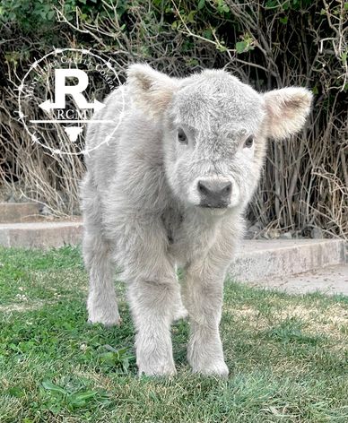 Here is what little cow dreams are made of - The Silver Chondro Highland Heifer. Born on March 8th without a hitch, we welcome baby Silver Belle to the ranch. She is sired by RCM Silver Sterling and RCM Flo - Small Framed 43 inch White Highland Cow. Silver Belle was born at 20 inches tall, 36lbs and loaded with hair and personality. She is going to be a spectacular foundation female one day when she grows up!